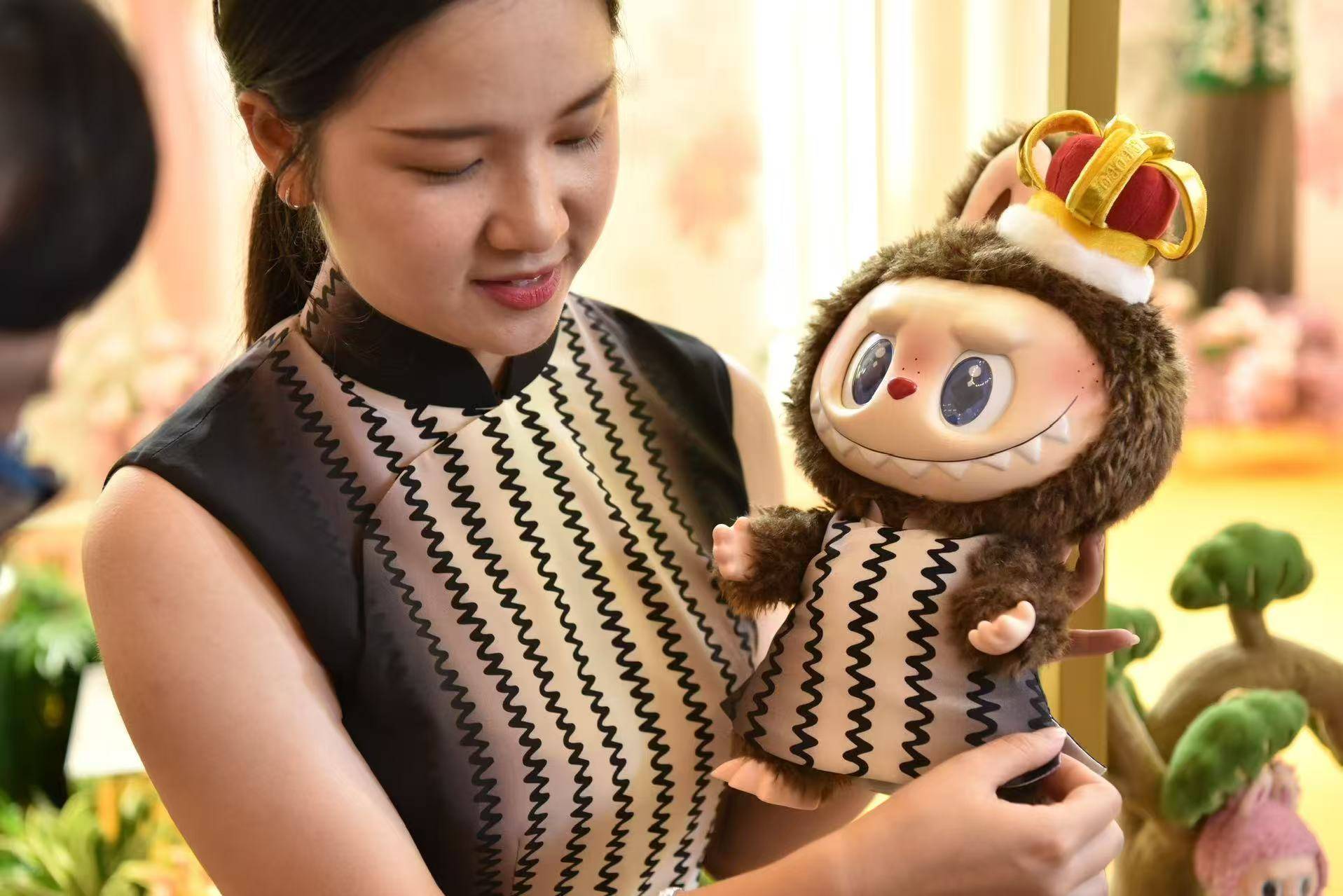 在开开集团展位非遗技艺不再是橱窗里的展品,而是走进生活的“日常美学”。龙凤旗袍带来的“九霄龙吟”苏绣盘银马甲,以灰色真丝素缎为底,耗时半年纯手工绣制,银线勾勒九龙腾跃图景,融入江崖海水等吉祥元素,现代廓形让苏绣成为可穿的“移动风景”。“三相映禧”三联盘扣画,则将旗袍盘扣工艺嵌入家居装饰,让非遗见证家庭的平安喜乐。更值得关注的是,龙凤与亨生借“潮玩经济”之势,为LABUBU等知名潮玩定制专属“高定”娃衣,以年轻化路径推动非遗成为年轻人的“社交货币”。