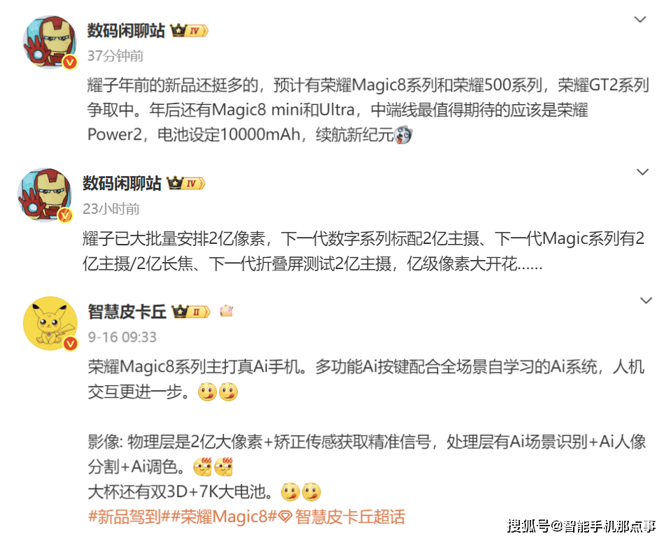 比如荣耀旗下包括Magic系列、数字系列、GT系列在内的多款新机近期密集曝光,其中,最受瞩目的Magic 8系列计划于10月中旬发布。