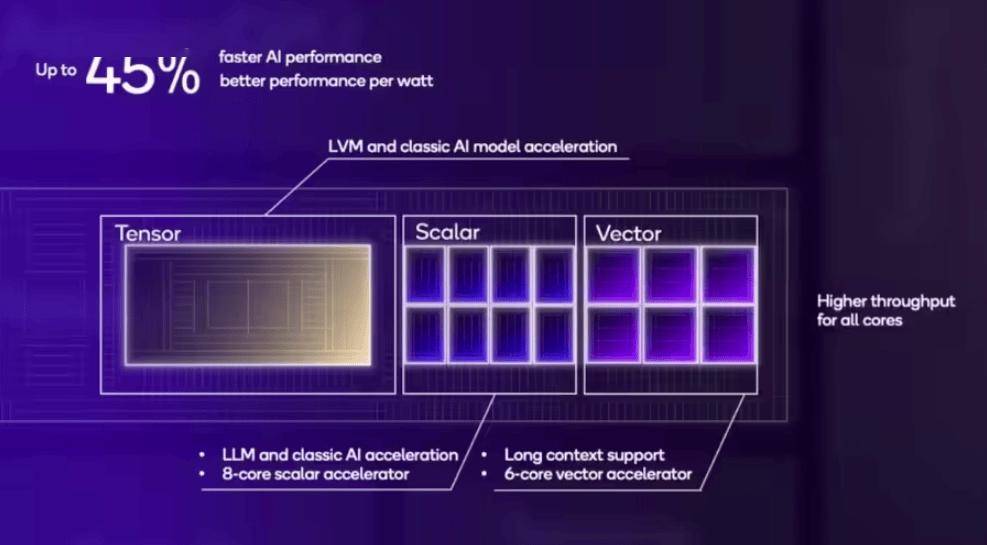 去年的骁龙 8 至尊版,其集成的高通 Hexagon NPU 增加了额外内核,拥有 6 核向量处理器和 8 核标量处理器,可进一步满足生成式 AI 运算不断增长的需求。AI 性能提升 45%,并支持 70+ tokens / s 的处理速度,用户可以上传更大的文档、音频和图像,让手机在处理复杂任务时能够更加游刃有余。
