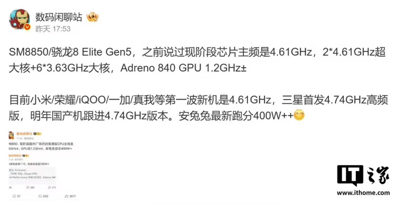 关于第五代骁龙 8 至尊版,目前也有诸多消息得到了曝光。首先是 CPU 部分,根据目前已经掌握的信息,第五代骁龙 8 至尊版将延续“2 超大核 + 6 大核”的八核心设计,但主频与架构优化显著。据数码博主 @数码闲聊站爆料,该芯片的 2 个性能核心时钟频率达 4.61GHz,6 个能效核心时钟频率为 3.63GHz,而三星还将通过独家协议推出超频版,主频进一步提升至 4.74GHz,国内手机品牌将于明年跟进这一版本。