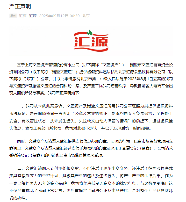 汇源厂房资料图 图片来源:每经记者 彭斐 摄 昔日“果汁大王”经历破产重整,迎来新资本入局,但公司并未就此走上坦途。 9月,北京汇源食品饮料有限公司(以下简称北京汇源)公众号发出声明,称上海文盛资产管理股份有限公司(北京汇源重整投资人,下简称文盛资产)、诸暨市文盛汇自有资金投资有限公司(文盛资产参与北京汇源重整而设立的持股平台公司,下简称诸暨文盛汇)未支付重整投资款、私刻公司公章,严重扰乱公司经营秩序,导致各大电商出现断货情况。 图片来源:北京汇源微信公众号文章截图 另一边的说法是什么?《每日经济新闻》记者9月25日获得了一份“致北京汇源全体员工公开信”(为作区别,以下简称《致员工公开信》)。《致员工公开信》显示,北京汇源新任总经理王清汉认为北京汇源向原控股股东违规支付款项,有掏空公司的嫌疑,且一直未落实公章交接,所以王清汉才将公章登报作废并换领新的工商执照、重印公章。 “以前只是管理层的控制权之争,但现在已经波及了员工。”9月25日,一位北京汇源员工告诉《每日经济新闻》记者:“我们今天下午收到公司群发短信,称拟在9月25日前缴纳的全员社保、公积金费用,因王清汉个人原因没法按时缴纳。” 对上述说法,王清汉方面的薪资服务专员发朋友圈称:公司已足额为全体员工缴纳社保、公积金。 是非曲直各执一词,无从判断,唯一让外界确定的是,北京汇源的这场“联姻”已从最初的牵手合作走到如今的多方拉扯,偏离了轨道。 官方旗舰店线上缺货 是北京汇源主动断供? 近日,有消费者发现,天猫、抖音等平台上的“汇源官方旗舰店”内已无货。9月25日下午,记者也查询发现,对应网店依旧处于无商品状态。客服称:“店铺正在升级调整中,会尽快上架商品。” “汇源”微信公众号的“官方店铺”中,商品无法加购。“汇源健康”微信小店中,只有两款商品在售。 图片来源:抖音截图 不过,各类汇源品牌授权经销商的店铺中,汇源牌商品正常销售。这或许说明,供应链问题出现在北京汇源内部。 9月23日,北京汇源一位内部人士告诉记者,是北京汇源主动停掉了对各大平台的供货,直接原因是“北京汇源的账户被诸暨文盛汇控制了”。 “电商平台的经营收入最终都会打款到北京汇源的账户中,但这个账户被诸暨文盛汇方面掌控。如果不暂停发货,就相当于北京汇源发货,诸暨文盛汇收钱。”上述内部人士说,虽然这样做肯定也会影响北京汇源的经营。 9月23日,《每日经济新闻》记者还从北京汇源内部人士处了解到,汇源品牌的线下经营商暂时没有受到供货影响,“但北京汇源目前正在通知各大经营商,希望进行对公账户的变更”。 “目前汇源品牌的生产线没有停摆,仍在正常运行,库存亦尚可。”上市知情人士介绍。 该人还详细介绍道:“因为生产主要由汇源集团方面(北京汇源饮料食品集团有限公司)负责,(所以生产)这部分影响不大。北京汇源主要负责运营销售体系,并拥有汇源的商标,是文盛资产及诸暨文盛汇收购重整的对象。汇源集团生产产品,北京汇源是要给预付款,买材料的。” 记者查询天眼查了解到,汇源集团创始人朱新礼通过持有北京汇源控股有限公司(下简称汇源控股)80%股份,仍控股汇源集团等公司。这意味着,虽然北京汇源走上破产重整之路,但汇源品牌产品的生产仍有原管理层的参与。 “老朱一直在。”北京汇源内部人士也说道。 新老管理层对峙:公章交接了吗?员工薪资会发吗? 汇源断货事件是双方激烈对峙的外部显现,而从近一个月北京汇源的工商信息变更中,也能窥见这种对峙,而且这种对立是围绕高层发生的。 北京汇源近期的工商信息变更 图片来源:天眼查App截图 自北京汇源在8月9日发布《致全体股东及转股债权人的公开信》以来,双方密集交锋。 8月22日,北京汇源发生工商信息变更,王清汉出任公司总经理,周智杰(文盛资产法定代表人名为周智杰)成为董事长,原董事长鞠新艳、原总经理咸晓芳等人退出。公司法定代表人也由咸晓芳变更为王清汉。 记者获得的《致员工公开信》显示,王清汉今年6月己通过董事会决议当选公司总经理,并正式到任。“然而令人遗憾的是,原管理团队未能尊重并执行董事会的有效决议,拒绝进行工作交接,拒绝办理必要的工商变更登记手续。这些行为直接导致新任总经理与员工之间丧失有效的沟通与协作渠道,至今无法正常履行总经理的法定职责。”《致员工公开信》中写道。 北京汇源原董事长鞠新艳还于7月向法院起诉,请求判令上述董事会决议(任命新总经理等)无效,该诉讼案已于9月15日进行现场庭审。目前,该诉讼案有待法院判决。 可以看出,对北京汇源“章、证、照”的控制权,是新老管理层的一大矛盾。王清汉方面称,原管理层始终未落实“章、证、照”交接,新任总经理因此才声明相关印章、证照已遗失并作废。 控制权的争夺,还可能波及员工的工资、社保和公积金。 王清汉在《致员工公开信》中对此表示,因人力资源负责人拒绝向王清汉汇报薪资发放安排,8月工资将采取“员工自行申报、公司复核发放”的方式。王清汉还表示,将适时换签新劳动合同。 王清汉方面的薪资服务专员9月25日在朋友圈发文“请大家安心” 图片来源:手机截图 《致员工公开信》发布后的9月20日,北京汇源向员工发短信,表示工资“不需要员工逐