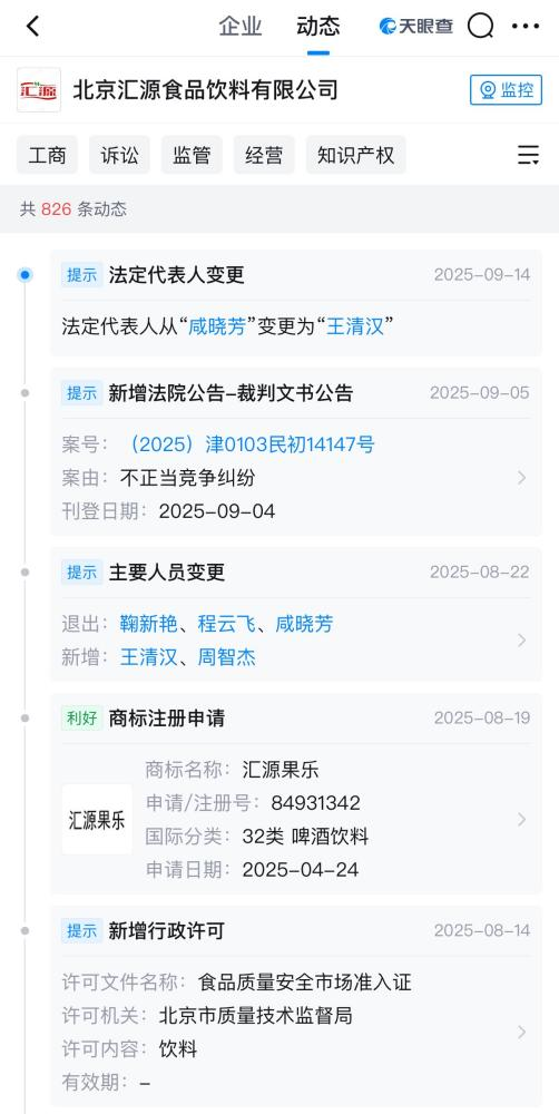 8月22日,北京汇源发生工商信息变更,王清汉出任公司总经理,周智杰(文盛资产法定代表人名为周智杰)成为董事长,原董事长鞠新艳、原总经理咸晓芳等人退出。公司法定代表人也由咸晓芳变更为王清汉。