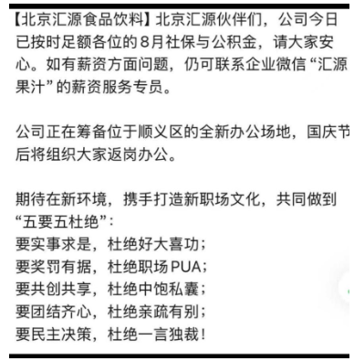 之后,员工们又收到北京汇源发送的统一短信,其中称王清汉篡改了社保及公积金登录信息,导致公司至今无法按规定缴纳全体员工社保、公积金。